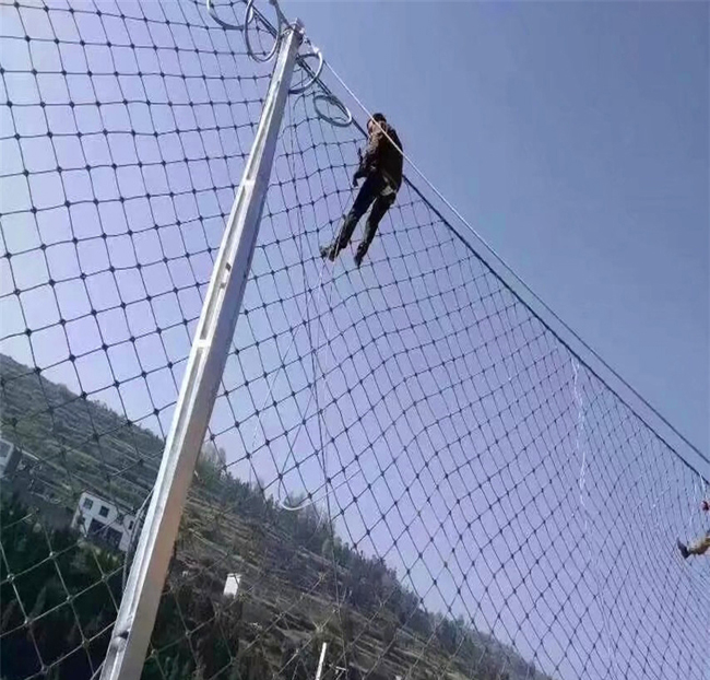 施工程序:錨桿及基座定位→基坑開挖與混凝土或鉆錨桿孔→基座及錨桿安裝→鋼柱及拉錨繩安裝與調試→支撐繩安裝與調試—環形型網的鋪掛與連接→格珊的鋪掛。