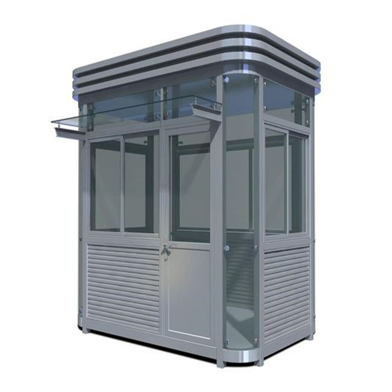 1、鋼結構崗亭材質:50*50*2.0mm鍍鋅管鋼架打磨除銹,國標槽鋼做造型,鋁合金百葉造型,地彈門帶雨棚,頂部鍍鋅板拉彎刨槽,頂部四角大圓,四面弧形鋼化玻璃拉彎,固定玻璃為8mm厚度白玻,推拉窗為5mm厚度白玻,地面鋼架上鋪15mm厚度防潮板,再鋪1.0mm厚度花紋防滑鋼板,崗亭內加豪華pvc板吊頂。