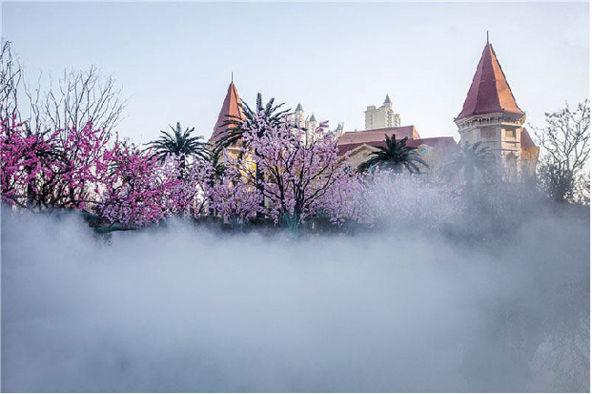 4.景觀造霧:霧氣是靈動的、飄逸的,隨風向、氣壓等環境因素的變化而變,能造成隨時可變的不同景觀。靜止的建筑、樹木、景觀隨著云霧的變化也會顯現出自己的靈動,景觀層次得到充分體現。