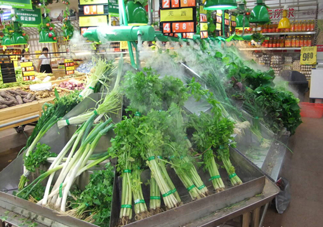 果蔬的保鮮方式有很多,常用的有冷柜保鮮、風幕柜保鮮、果蔬貨架噴霧保鮮。現在超市普遍使用的是霧化保鮮方法,主要就是采用噴霧的方式更方便消費者挑選。采用噴霧加濕的方法需要將果蔬放到展柜上,可以任由顧客挑選,果蔬是否新鮮也一目了然。放入冷藏柜,消費者在挑選時還要打開冷藏柜的柜門,比較麻煩,蔬菜的新鮮度也不容易辨別,因為消費者不知道這是在冷藏柜放了多久的食材。因此噴霧保鮮的方式更受超市的歡迎。