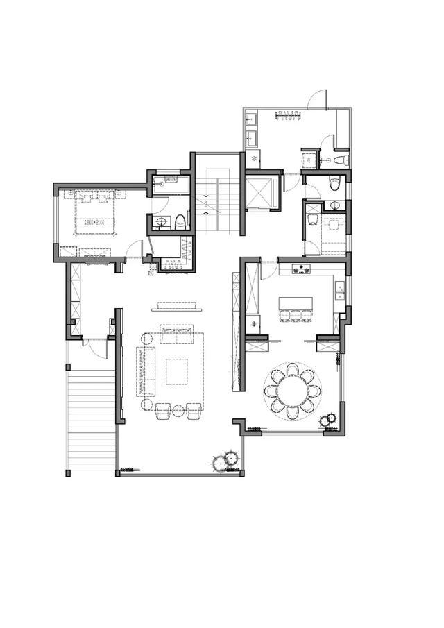 一層作為家庭的主要休閑功能區,禪茶一體,酒通仙道。色彩和肌理作了一個有別于其他的轉變,原石粗礦與鐵板細膩的對比,為入口旁玻璃封閉的酒窖多了幾分趣味;多功能室白色墻頂界面區分、黑色雞翅木家具、質樸的石材墻面,靜謐而沉穩;