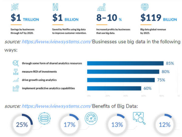 大數據描述了企業在日常活動中收集的大量結構化或非結構化數據。盡管數據量很重要,但大數據這一術語更側重于數據的組織以進行進一步分析。該分析用于為企業收集見解,以做出更好、更具戰略意義的決策。大數據對節省成本和獲得利潤有以下影響(見下圖):