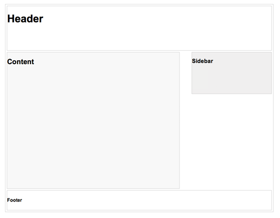 在這個(gè)例子中,頁面布局包括 Header, Content, Sidebar和Footer. Header固定高度為180px, Content寬600px, Sidebar寬300px。