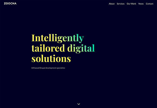 漸變不只是背景和照片疊加。一個(gè)堅(jiān)實(shí)的梯度也可以增加對(duì)文本元素的強(qiáng)調(diào),當(dāng)使用的目的。印刷術(shù)的發(fā)展趨勢(shì)是向更簡(jiǎn)單的字體傾斜,并帶有一點(diǎn)“額外的東西”。這些額外的東西可以是任何東西,從照片填充到流行色到文本處理,例如大小寫(xiě)或動(dòng)畫(huà)。現(xiàn)在…梯度。誠(chéng)然,如果你不喜歡漸變,這可能是一個(gè)很難遵循的趨勢(shì)。(你的平面設(shè)計(jì)純粹主義者知道你是誰(shuí)。)但它們絕對(duì)是驚人的。Zoocha使用了一個(gè)巨大的淡黃色和藍(lán)色的漸變?cè)谝粋€(gè)現(xiàn)代的襯線,在一個(gè)主要是普通的屏幕。這個(gè)設(shè)計(jì)的訣竅是漸變。其他設(shè)計(jì)的簡(jiǎn)單性讓它脫穎而出。