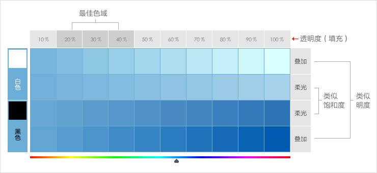 (上圖示例中,調(diào)整疊/柔模式的黑白色塊的不同透明度(取10%到100%整數(shù)值為例)就可以得到差異較明顯的40種配色,通過這種技巧,理論上每一種顏色都可以輕易獲得無窮盡的'天然配色',并且是'0失誤'!)