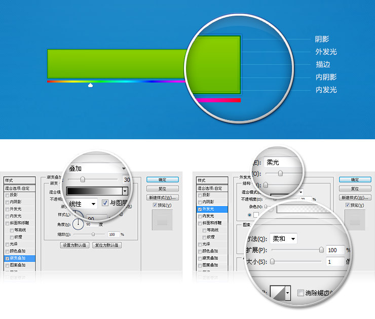 通過混合選項(xiàng)中的'陰影、外發(fā)光、描邊(不適用疊柔法)、內(nèi)陰影、內(nèi)發(fā)光'可以自由的刻畫5層像素級(jí)細(xì)節(jié)(當(dāng)然,通常在實(shí)際的使用中刻畫1到3層即可)。