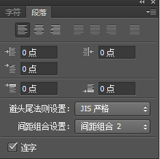 一般句號、問號、嘆號、逗號、頓號、分號、冒號等不能出現(xiàn)在行首;換言之,引號、括號、書名號等的前半部分不能出現(xiàn)在行末,后半部分不能出現(xiàn)在行首。很多專業(yè)的排版軟件比如Photoshop/Illustrator/Indesign/方正飛騰在段落設(shè)置面板中都有如下圖的設(shè)置:段落面板—避頭尾法則設(shè)置:JIS嚴(yán)格
