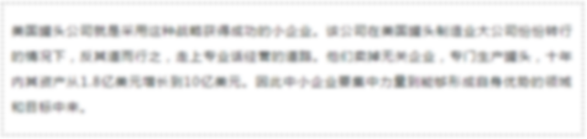 專業化經營戰略也叫“小而精,小而專”,是根據中小企業規模較小,資源有限等特點制定的一種戰略。中小企業實力較弱,既可在狹窄的產品線和市場上擴大批量,提高質量,贏得競爭優勢,又可為大企業提供配套產品,從而以小補大,以專制勝。
