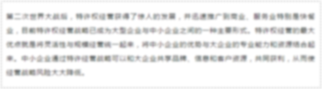 中小企業利用大企業提供的產品、服務或品牌在特定范圍內的經營權,以給予大企業一定比例的營業收入或利潤作為特許費為條件,即可在規定的區域內享有一定的壟斷和獨立經營權利。